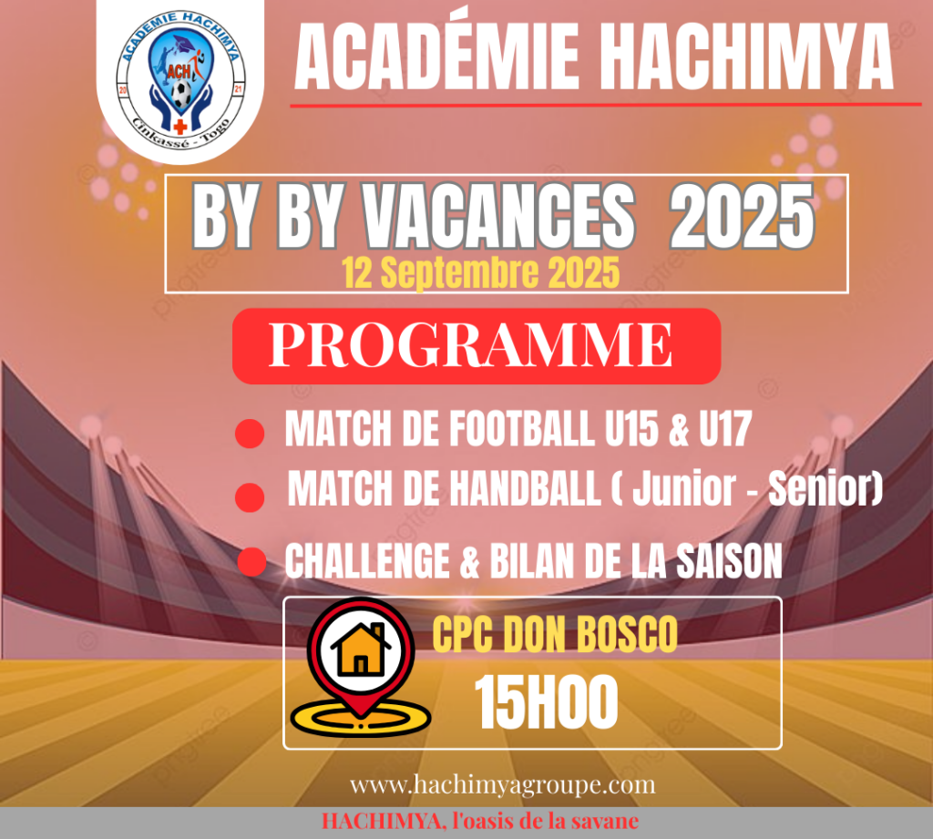 Ainsi, « By By Vacances 2025 » dépasse la simple idée d’un tournoi de fin de vacances. C’est une célébration de la jeunesse, une communion entre générations, une reconnaissance des efforts collectifs et un témoignage vibrant de l’esprit qui anime l’Académie Hachimya. Dans l’enceinte du CPC Don Bosco, sur fond d’enthousiasme et de fraternité, se jouera une nouvelle page de cette aventure humaine et sportive qui fait de l’Académie une véritable oasis pour la savane.